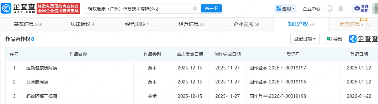近日,蚂蚁集团旗下蚂蚁逸康(广州)信息技术有限公司登记“日常版阿福”“蚂蚁阿福三视图”“运动健康版阿福”作品著作权,作品类别均为美术。据媒体报道,去年12月,蚂蚁集团宣布旗下AI健康应用AQ品牌升级为“蚂蚁阿福”,并发布App新版本,升级健康问答、健康陪伴、健康服务三大功能。